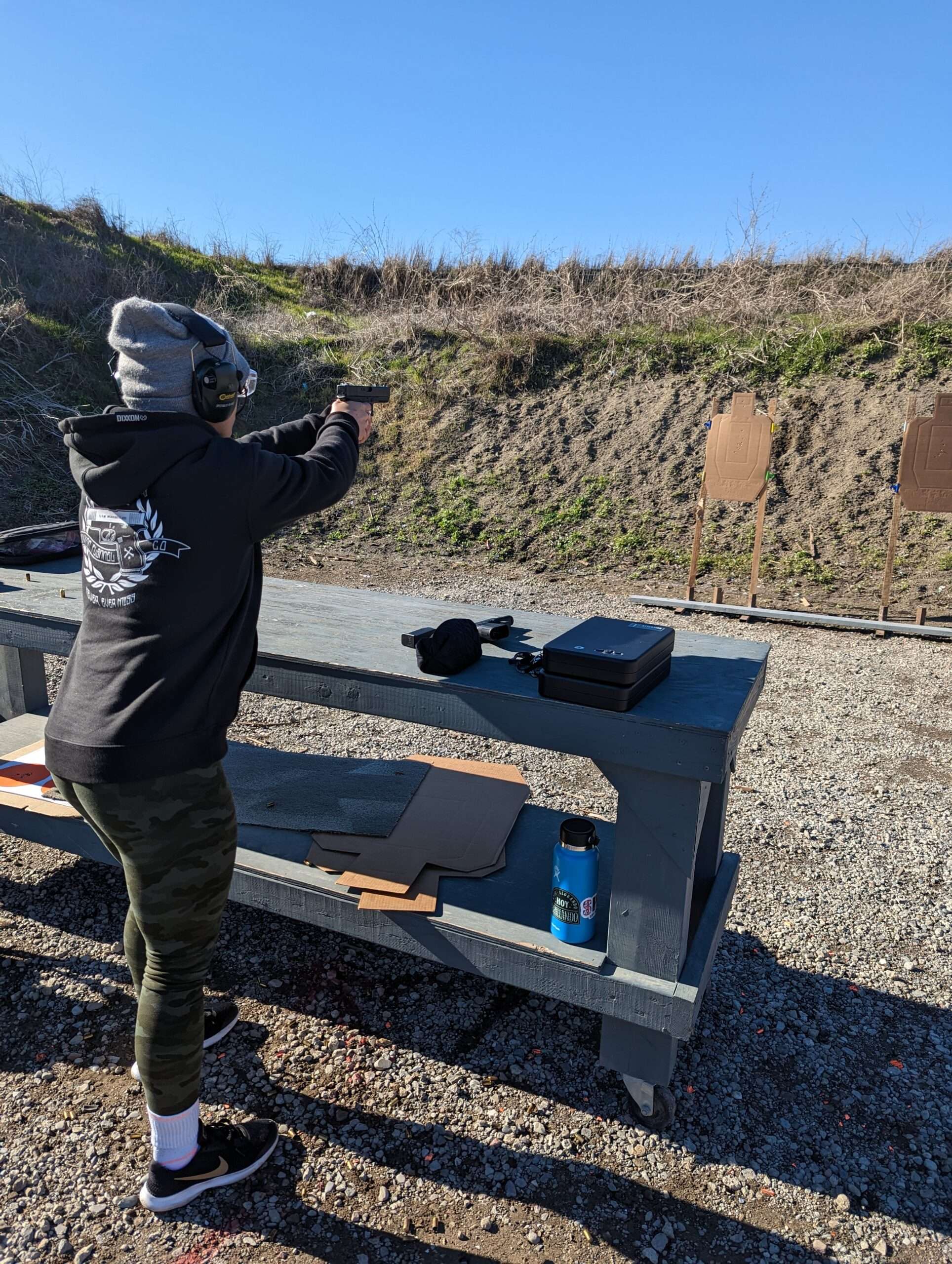 Session is conducted on a pistol shooting lane at the outdoor public range. There may be other shooters in the adjacent lanes.